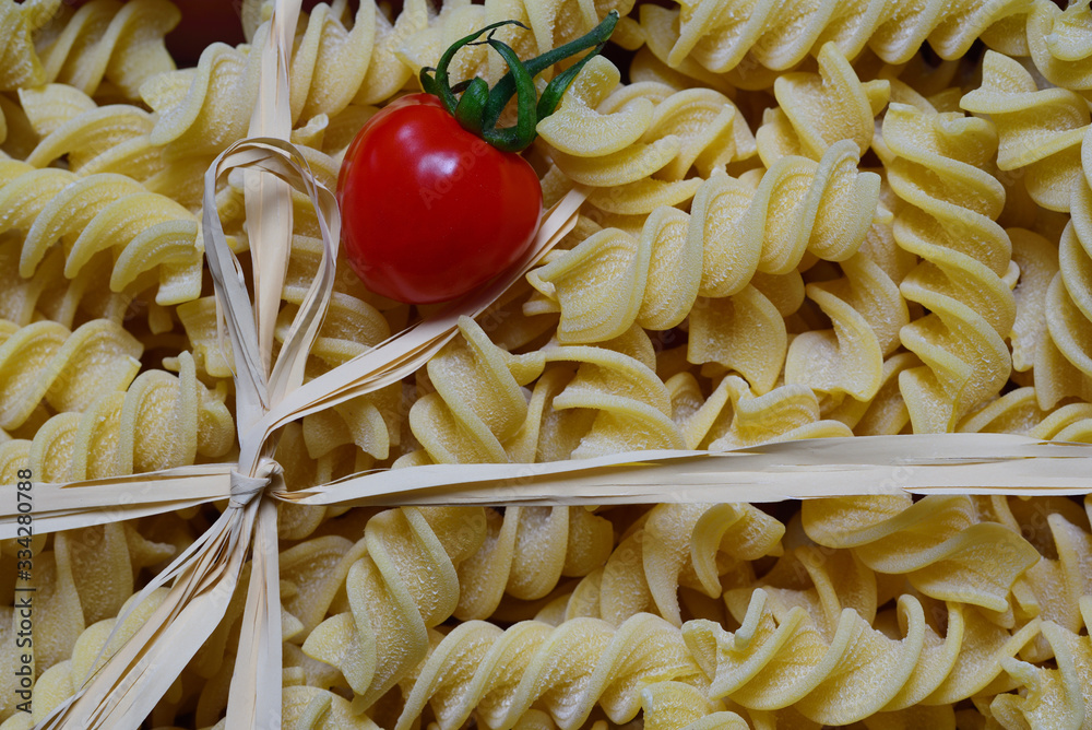 Close-up, background and texture of raw spiral pasta wrapped in a bast bow and a red tomato