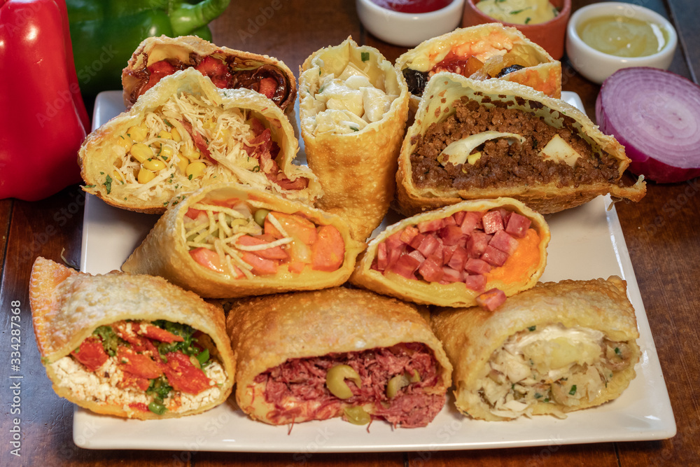 Pastel com bastante recheio de vários sabores em exposição no prato branco grande em uma mesa, Pastel with lots of different flavors on display on the big white plate on a table