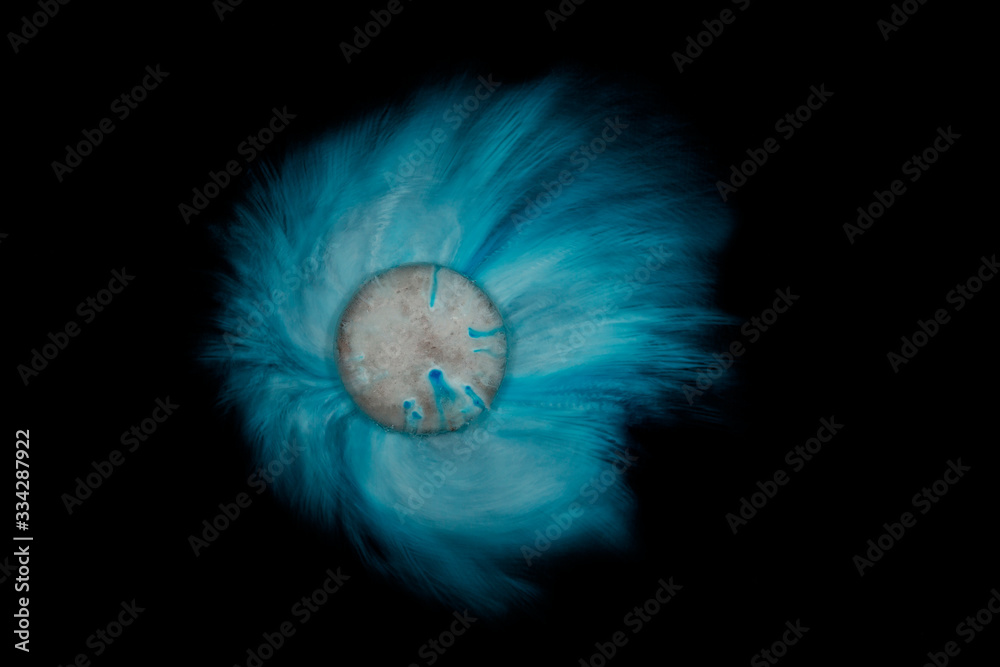 Blaue Schokolinse löst sich im Wasser, optisch ähnlich einem Planeten im All.