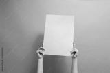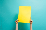 Hands holding a yellow paper banner with blank space for your text. Isolated on blue