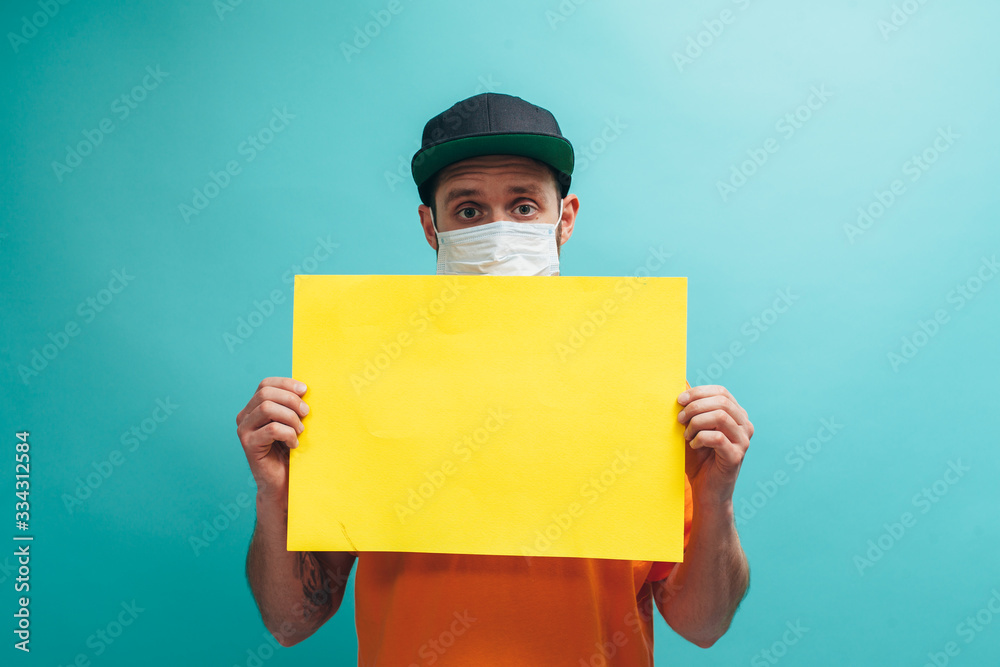 Studio portrait of young man wearing a medical face mask as a precaution from viruses infection with yellow paper banner with blank space for your text. Isolated on blue