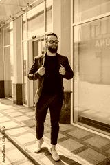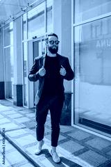 Handsome man with beard in trendy formal suit. Guy with beard wearing black long sleeve t-shirt or sweater with space for your brand name or label. Mockup for print