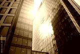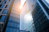 Skyscraper, modern building in the city with sunlight. Glass wall of an office building in the sunlight. Office building window close up with sunrise, reflection and perspective.