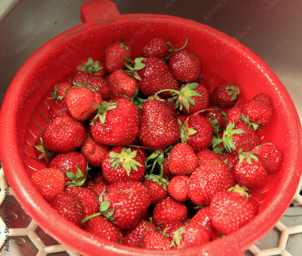 Freshly cleaned red strawberries in a sink