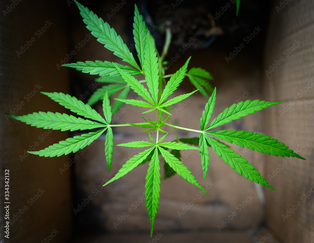 Close up of flowering cannabis plant (Marijuana) in a paper box. Marijuana is mostly used for recreation, medicinal drug or as a mix marijuana in food. The plant contains mind-altering chemical THC.