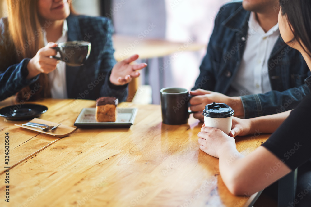 Closeup image of people enjoyed talking and drinking coffee together in cafe