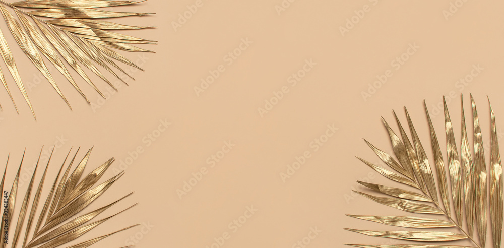 Gold colored tropical palm leaves on beige background flat lay top view copy space. Creative summer background with tropical leaves. Golden background, minimal nature concept