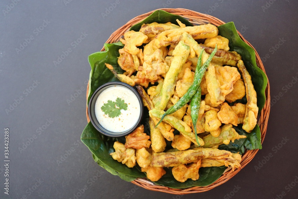 Mixed veg pakode or bhajiya, Pakodi, Bhaji is crisp fried spicy snack made using vegetables like chili, onion, potatoes, raw jack fruit, chickpea flour and spices. It is a popular street food in India