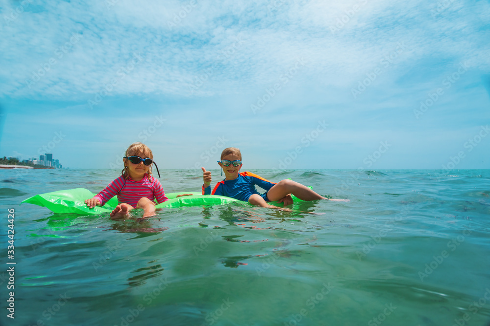 happy kids swim at sea, boy and girl enjoy vacation
