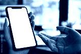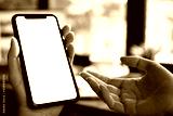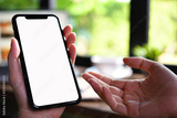 Close-up image of female hands using smartphone with blank white screen in the coffee shop
