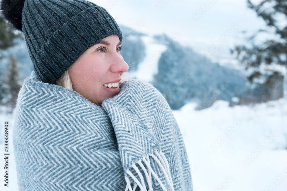 Portrait Happy woman traveler on the top of mountain and looking on beautiful winter snowy view.