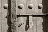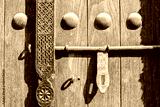 Sepia detail of a carving, doornails and lock on a traditional wooden Arabian door.