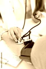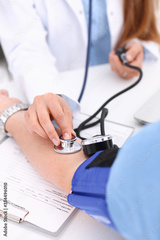 Female doctor arms make medic procedure closeup. Physical cure arterial beat exam tool nurse control and consult healthy lifestyle diagnosis therapeutist practice heal problem reception concept