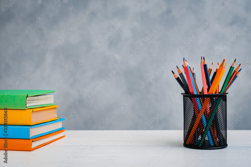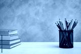 A stack of colorful textbooks and a glass of bright pencils on a gray- blue background.