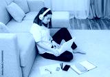 young girl teenage schoolgirl sits floor living room sofa student studying home working with her laptop doing homework