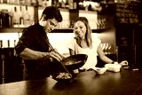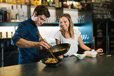 Young chef couple cooking noodle in a kitchen in a modern restaurant