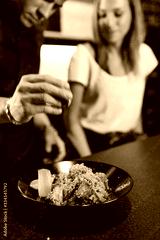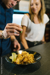 Young chef couple cooking noodle in a kitchen in a modern restaurant