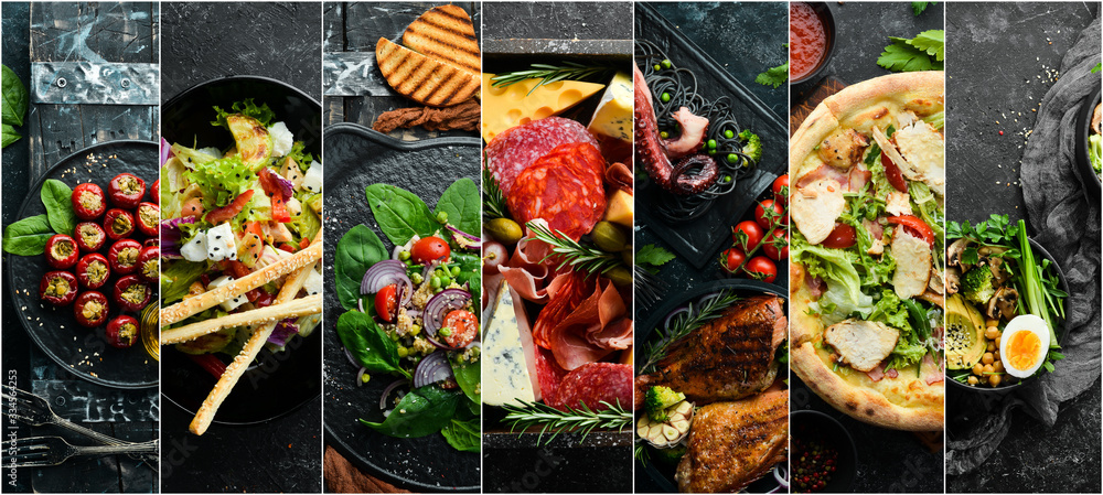 Food banner. Set of dishes on the table. Traditional cuisines of the world. Top view.