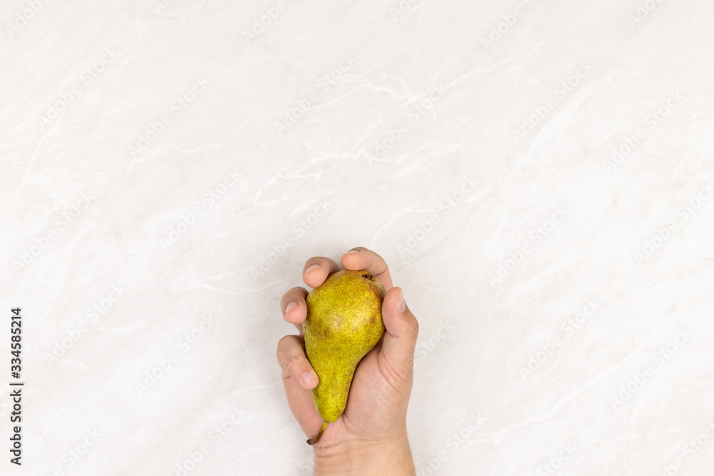 Fresh healthy Pear in the hand above grey marble table background with copy space