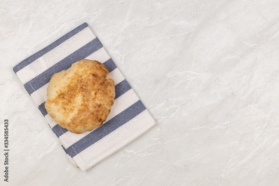 Flatlay above homemade bread on the wooden board with copy space