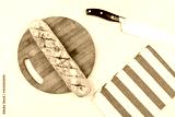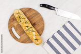 Baked and sliced bruschetta bread with garlic and spices served on the wooden board
