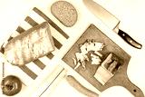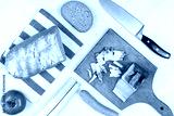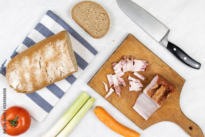 Flatlay above served sliced bacon with bread tomato leak and carrot on the grey marble table