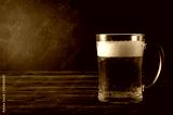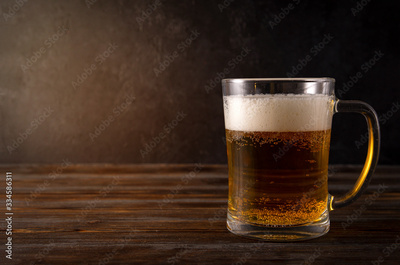 light beer, beer mug with foam on a dark wooden background, alcoholic beverage