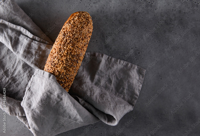 1 loaf of rye grain bread with grains with a gray napkin on a gray , baking, top view,