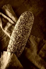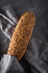 loaf of rye grain bread with a gray napkin on a gray , baking, top view,