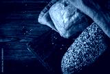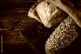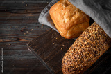 loaf of rye bread with grains and of wheat bread with a grey napkin on a dark wooden background top view,