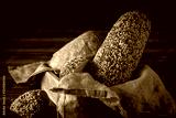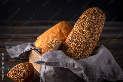 rye grain bread in a basket with a napkin on a dark background, wheat loaf