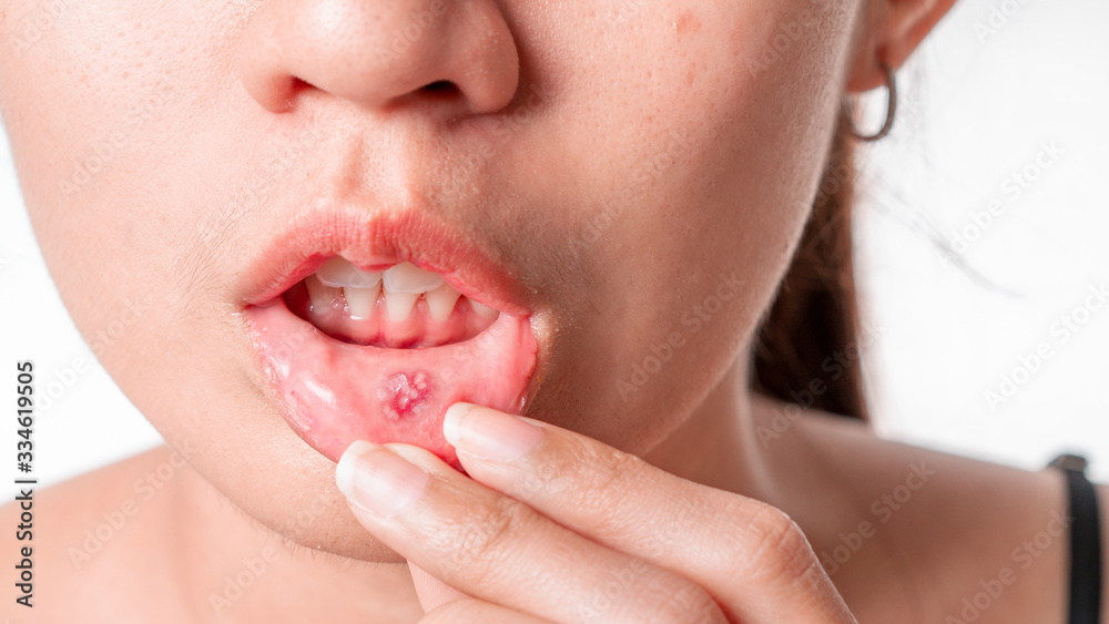 Asian women have aphthous ulcers on mouth on white background, selective focus.