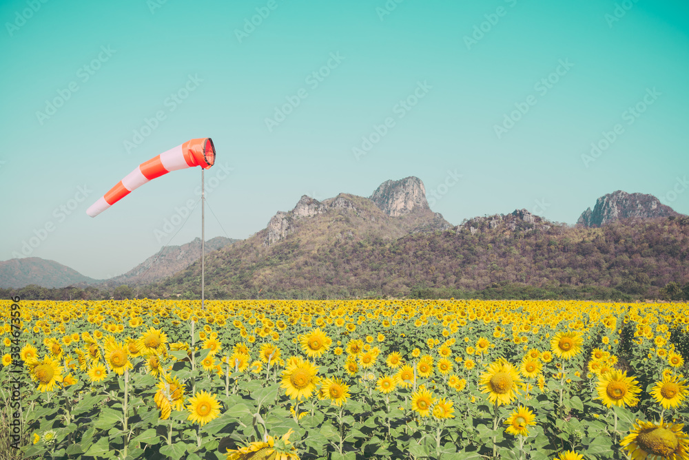 Beautiful blooming sunflowers field farming landscape with mountain hill and clear sunny day blue sky background in the summer morning, Thailand. Sunflowers oil is the non-volatile oil from seeds.