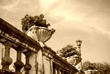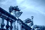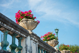 Beautiful red flower in classical white cement pot with blue sky background in summer season - Decoration in outdoor garden