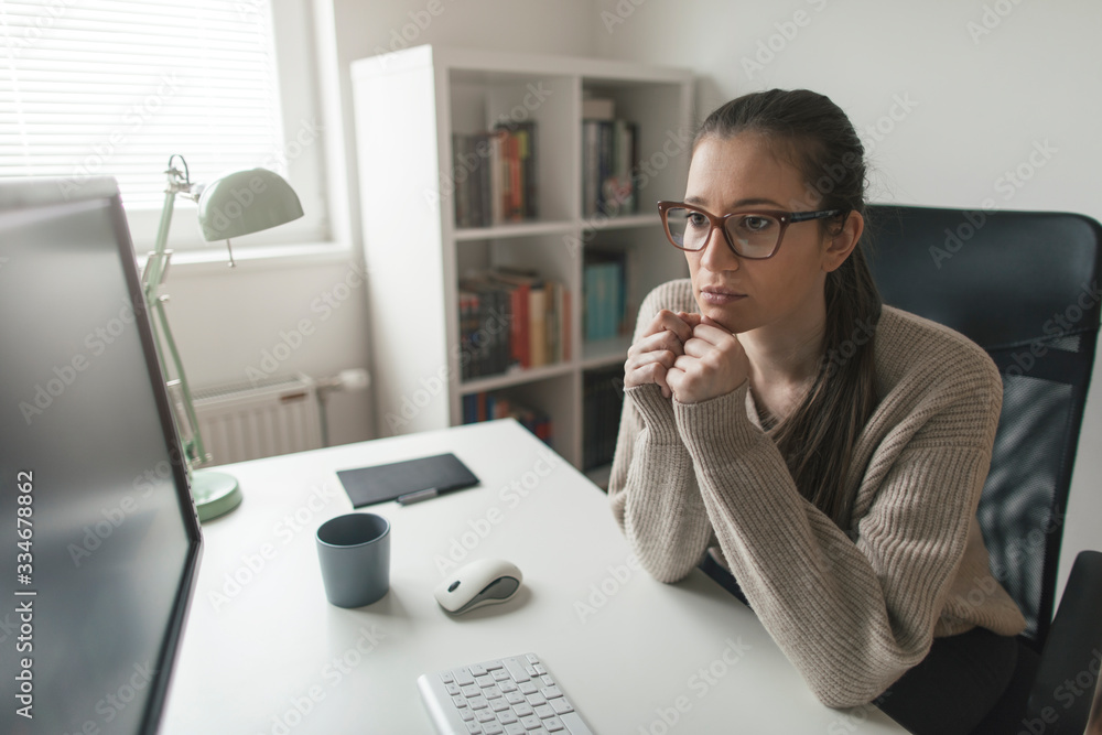 Young businesswoman working long hours from home office. Woman working from home