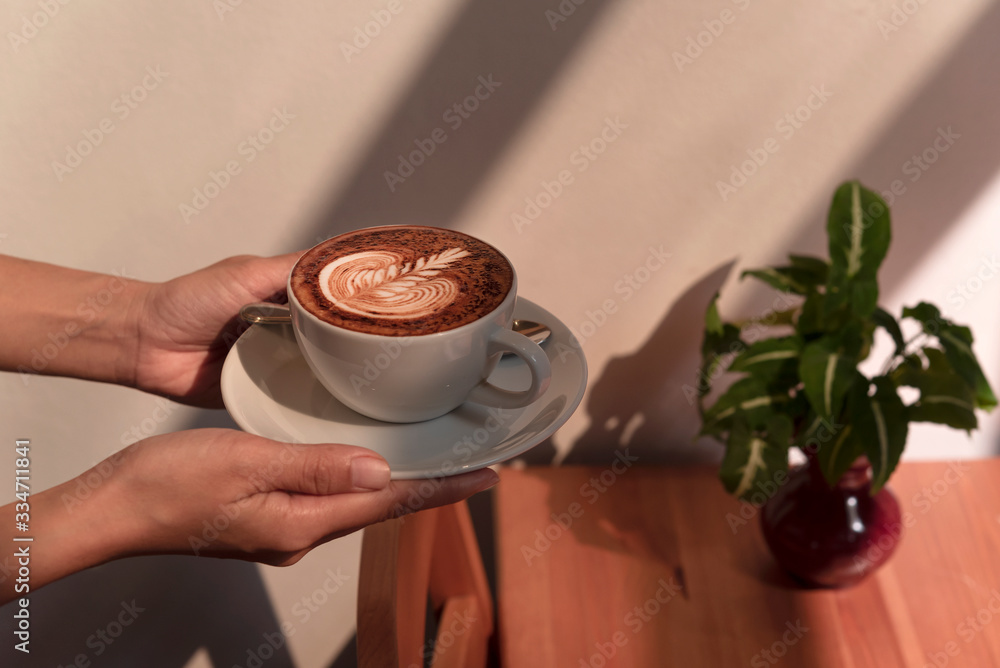 Hand holding latte or Cappuccino with frothy foam, coffee cup in cafe.