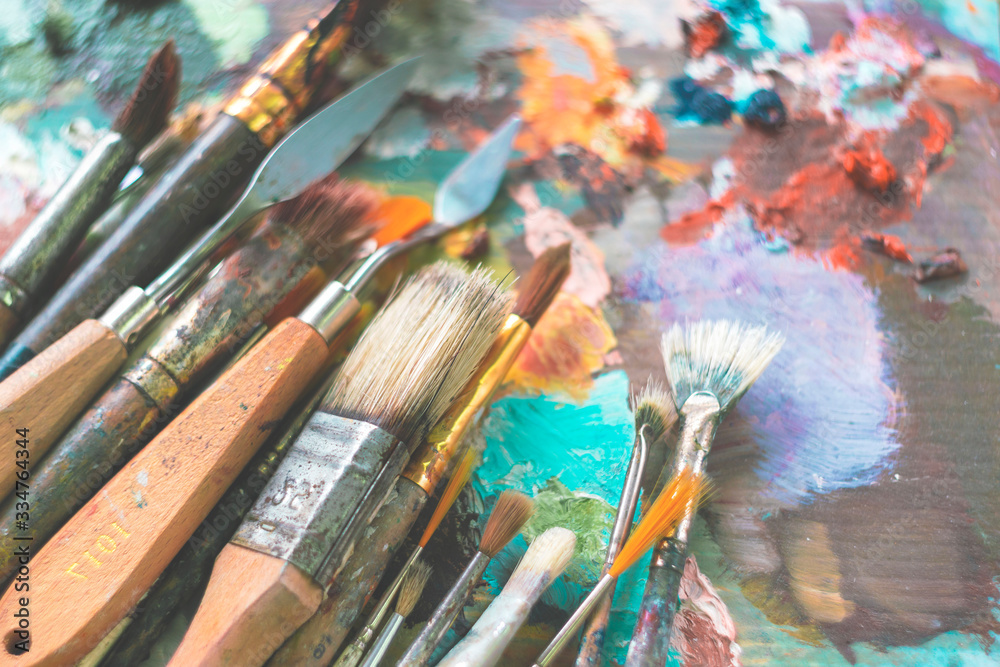 various brushes for oil paints are on the palette. set for the artist. multicolored background