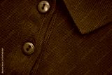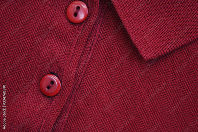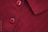 Dark polo shirt close up top view. Button-up burgundy red color shade short sleeve t-shirt, classic casual collar neck clothes. Plain unprinted polo shirt detail