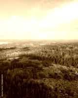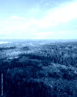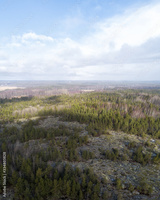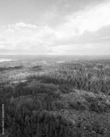 Aerial view of forest, green pine trees on a sunny spring day with a bright blue sky. Captured from above.