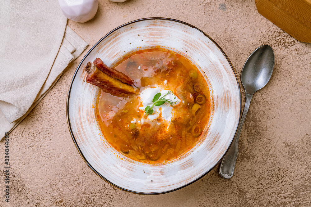 Meat Solyanka soup on beautiful plate