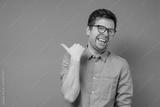Young man in glasses pointing with thumb finger aside isolated on pink background.