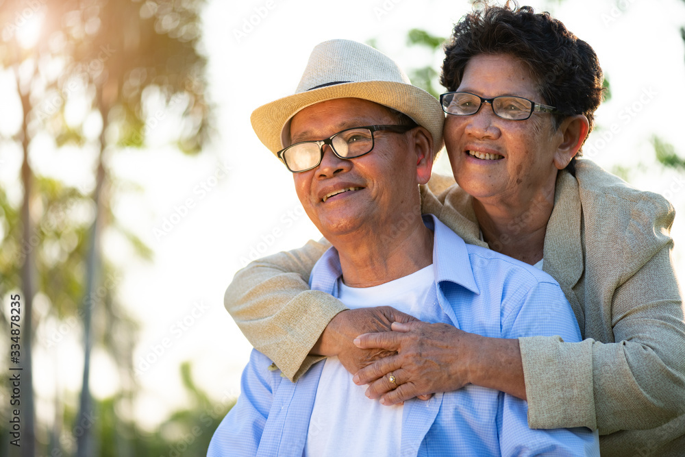 A happy senior couple asian old man and woman smiling and laughing in the garden, happy marriage. Senior healthcare and relationship concept.