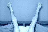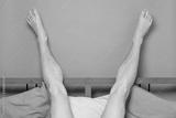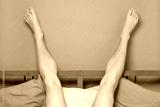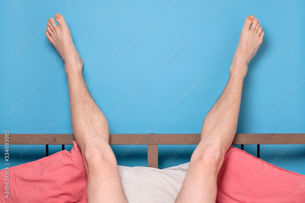 man legs resting in quarantine at bed at home. Inverted position or therapy against fatigue