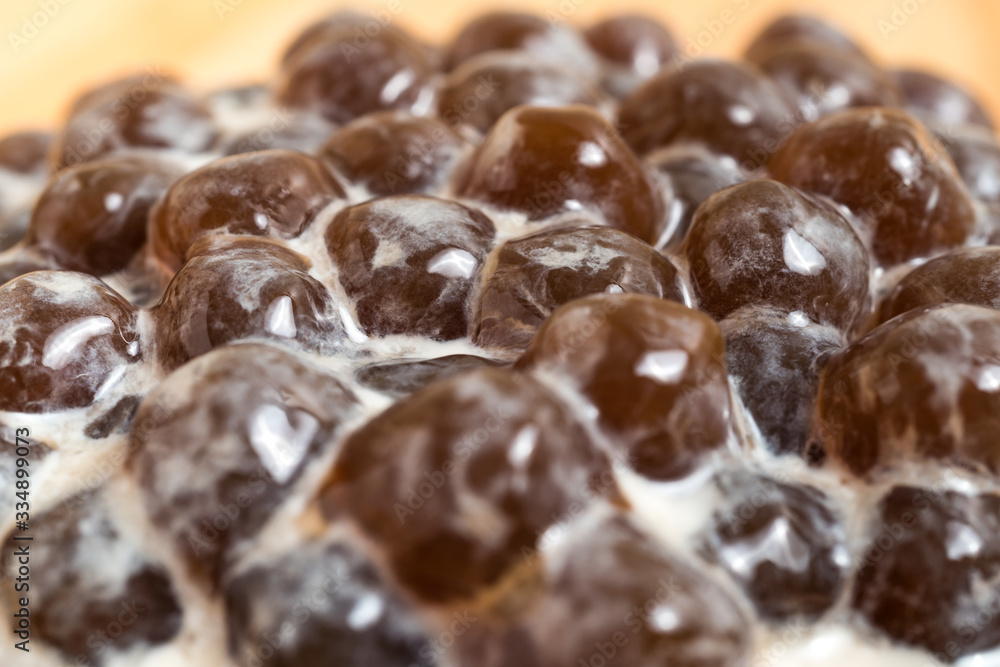 A glass cup of pearl milk tea (also called bubble tea) and a plate of tapioca ball on wooden background. Pearl milk tea is the most representative drink in Taiwan. Taiwan food . With copy space.