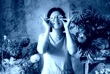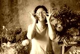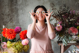 woman professional florist with humor poses with flowers eyes sitting wooden table with compositions wild flowers.
