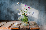 Beautiful bouquets of wildflowers on a wooden table on a cold concrete wall background.