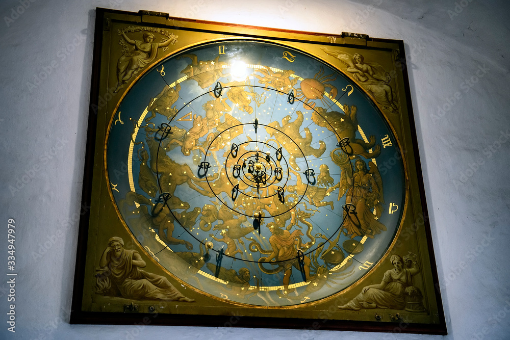 Astronomical clock in the interior of Round Tower Rundetaarn. Copenhagen, Denmark. February 2020