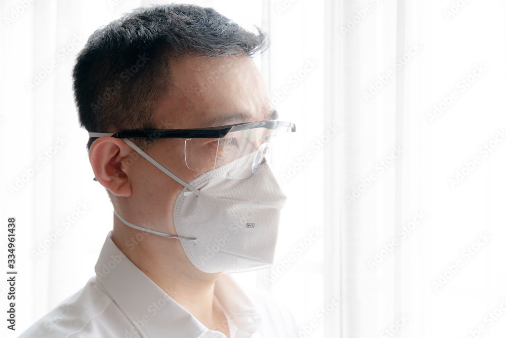 Asian man wearing safety google and N95 surgical mask to protect virus and COVID-19. Stay home, Work from home, Social Distance Concept.