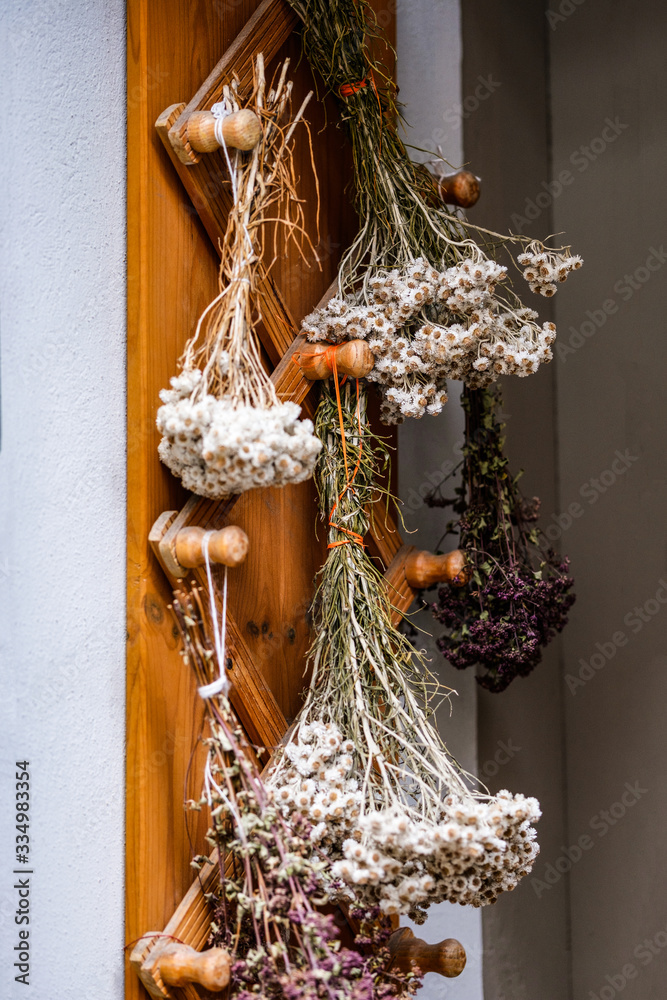 Dried flower and herbs bouquets hanging on vintage wooden hanger on white wall background. Wild dry chamomile and herbs for tea or decoration. Hipster nature tea shop entrance. Vertical, close up