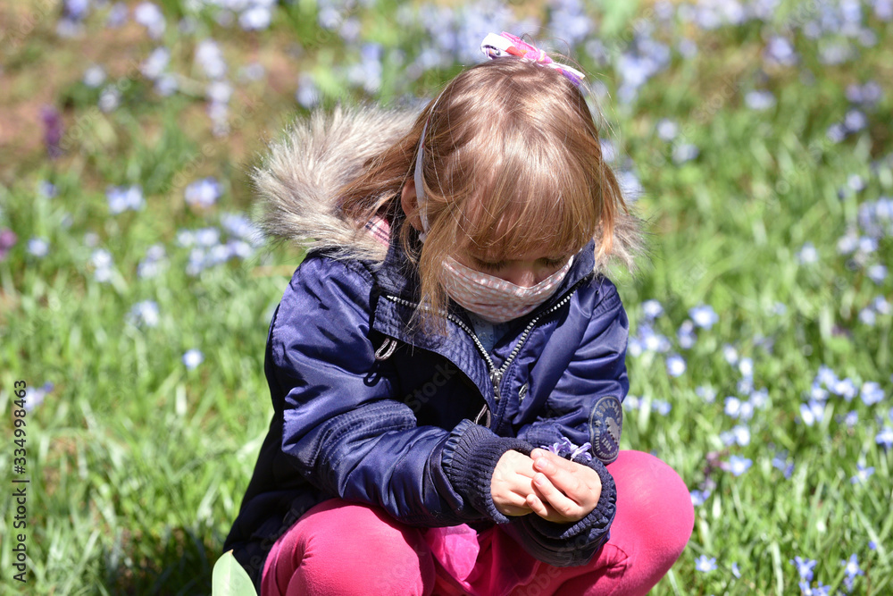 Young girl wearing a facemask for protection against coronavirus and playing outside.